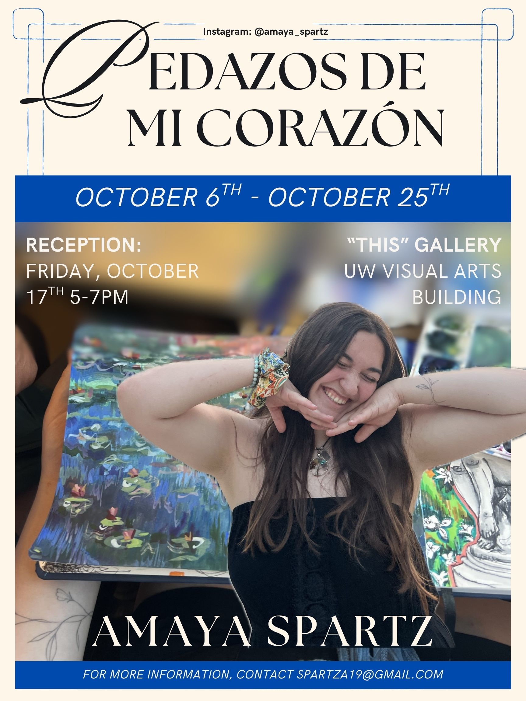 Located on the first floor of the UW Visual Arts Building, the This & That Galleries are designated spaces that provide undergraduate students within the Art & Art History program the opportunity to exhibit their creative work. Students gain professional experience by proposing a solo or group show. Once accepted, the student(s) organize the exhibition space and plan the receptions, and they advertise and promote the work by participating in interviews with local newspapers and radio stations. Exhibitions rotate every 2-3 weeks and students are allowed to have two exhibition slots before they graduate. Gallery Hours : Concurrent with Visual Art Building hours, closed on weekends. All Receptions are held at the gallery spaces just off the Visual Arts main lobby from 5 to 7 P.M.