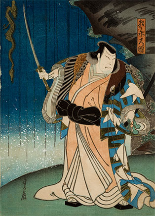 (Left) Hasegawa Sabanobu I (Japanese, unknown), Kabuki Play: Asao Yoroku II as Matsunaga Daizen, not dated, woodblock print, 9-11/16 x 6-7/8 inches, Friends of the UW Art Museum Purchase, 1982.11