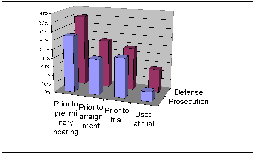 Success of cases before preliminary hearing. There were 47 defense lawyers who reported 157 cases that used the insanity plea before the preliminary hearing. In response to the question of how many of these were successful, 38 defense lawyers reported 103 cases. There were 34 prosecuting attorneys who reported 135 cases that used the insanity plea before the preliminary hearing. Of these, 22 prosecuting attorneys reported 41 cases as successful.