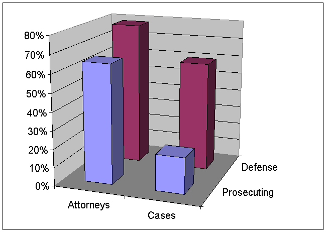 The average number of years practicing law by all attorneys was 12.3 years. The average years of practice for criminal defense lawyers was 9.3 years, for prosecuting attorneys 9.7 years, and for the general attorneys 13.6 years. The defense attorneys reported that an average of 33.7% of their time was devoted to criminal defense while the prosecuting attorneys reported that an average of 60.0% of their time was devoted to criminal prosecution. The average number of trials for defense lawyers was 50.5, while the averaging number of trials for prosecuting attorneys it was 69.3.