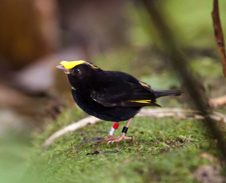 Ecuador: On the western slope of the Andes, the Mindo Cloudforest Foundation (MCF) runs the Milpe sanctuary at Km 91 near San Miguel de los Bancos (about 2.5 hours from Quito on the bus from the Carcelen station), where one can see Machaeropterus deliciosus, Club-winged Manakins, do their wing-hum display, and the fab Masius chrysopterus, Golden-winged Manakins, do their zip-snap-waddle dance on a mossy log (let us know if you see any of our banded birds). At MCF's Rio Silanche reserve (in from Km 126 on the Quito -- Puerto Quito highway, past Pedro Vicente), they have a great canopy tower and good leks of White-bearded Manakins (as well as occasional Red-capped and Blue-crowned Manakins).