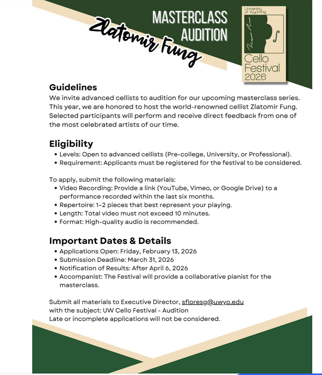 We invite advanced cellists to audition for our upcoming masterclass series. This year, we are honored to host the world-renowned cellist Zlatomir Fung. Selected participants will perform and receive direct feedback from one of the most celebrated artists of our time.