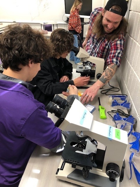 On December 1st, the Roadshow visited Skyline Academy High School, an alternative school in Pinedale, Wyoming. Justin Kinney and Sarah Zekovich, undergraduate students at UW majoring in Microbiology, lead the outreach. The students at Skyline Academy were learning about local environmental issues. To build on their learning, Justin and Sarah designed a hands-on activity based on their microbiology capstone research investigating the harmful cyanobacterial blooms occurring in the waters across Wyoming. The students started by sharing what they currently know about cyanobacteria then watched a short video created by the capstone students explaining their project and the local relevance. The students were then able to look at cyanobacteria from West Granite Springs through the microscope and draw what they were seeing. The high school students were then able to run their own DNA gel so they could visualize a plasmid that contains the gene coding for the toxin. Lastly, the students were able to create their own wet mount slides from water taken from the Pine River that runs through Pinedale to look for cyanobacteria.