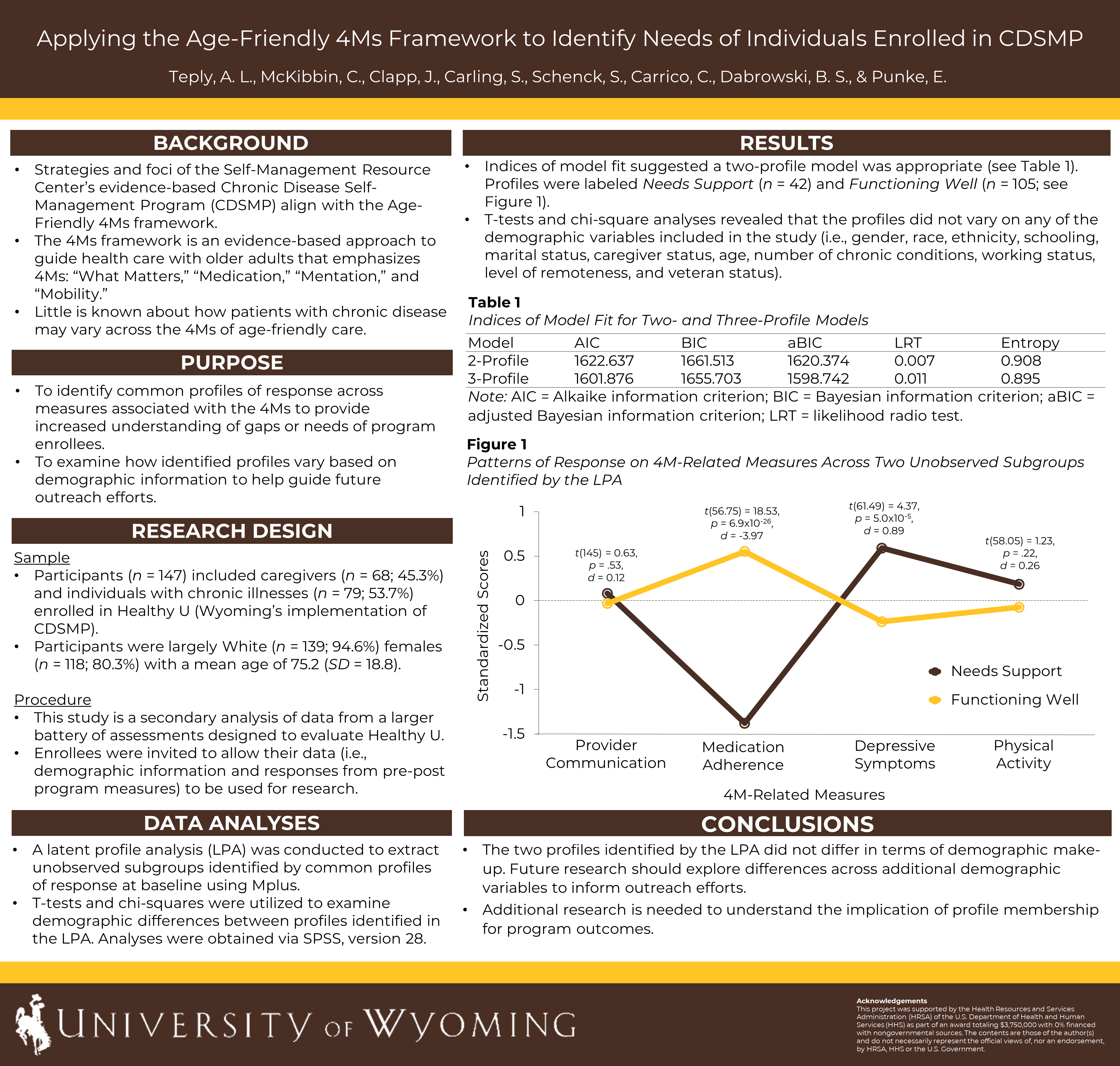 - Applying the Age-Friendly 4Ms Framework to Identify Needs of Individuals Enrolled in CDSMP. GSA 2024. Teply, A.L., McKibbin, C. L., Clapp. J., Carling, S.J., Goodwin, L., Carrico, C.P., Dabrowski, B.S. & Punke, E.